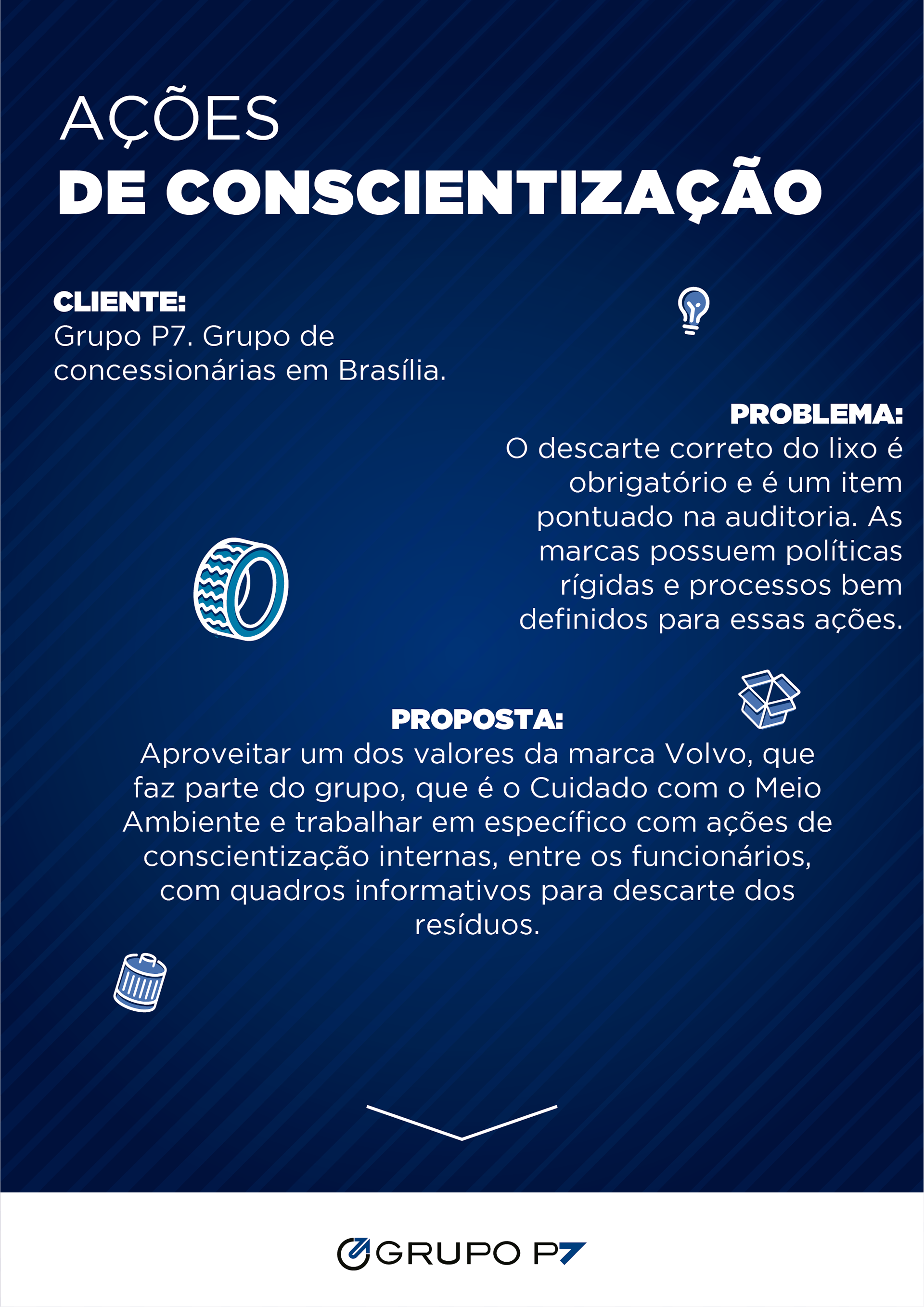 Como um grupo apoiado por fabricantes que se importam com pessoas, como a Volvo, nos preocupamos com o ambiente em que vivemos. Nesse sentido, todas se comprometem em fabricar carros com baixo índices de poluição, mas só isso não basta. Precisamos reinventar a sustentabilidade, indo além das operações com os carros e pensar toda vez em que uma decisão que afetará o mundo e a vida das pessoas será tomada, pois não adianta querer um mundo melhor sem dar o próprio exemplo. Fazer a nossa parte estimula outras pessoas a fazerem o mesmo, por isso, é muito importante que nossas atitudes do dia a dia sejam coerentes com o que propomos. Por isso apresentamos estes quadros em tamanho A3 em caráter informativo, contando um pouco dos processos de descarte dos materiais da concessionária.